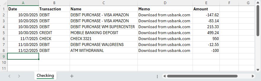 - Open that CSV file using Microsoft Excel, and reformat the data so that it has a similar column layout as the Excel checkbook template. This step includes the need to put deposits and withdrawals into a separate column since US Bank puts all amounts in one column.