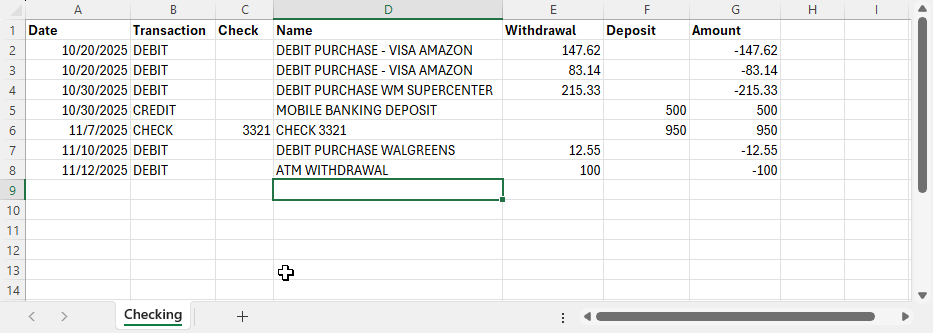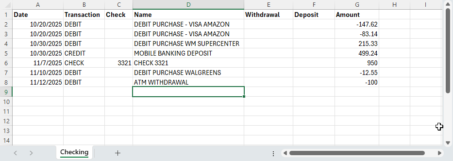 - Copy transactions from the CSV file and paste them into the checkbook template, starting in the row that immediately follows the starting balance (e.g., cell A8), or after any existing transactions that you have already added to the register.