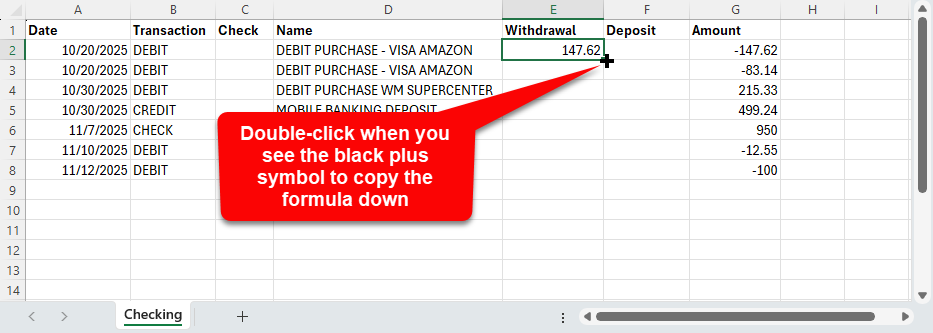 If your spreadsheet looks like the sample above with the Withdrawal column in “E”, enter the following formula into the E2 cell: